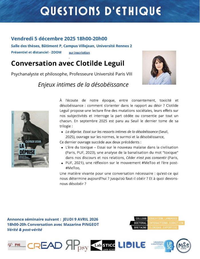 Nous sommes heureux de vous annoncer que nous lançons à Rennes un Séminaire interdisciplinaire de recherche – « Questions d’éthique » – soutenu par l’Ecole doctorale ELICCE du Grand-Ouest. Notre unité/laboratoire RpPsy (« Recherches en psychopathologie et psychanalyse ») est à l’origine de ce projet en partenariat avec un laboratoire de philosophie – le Caphi – et notamment Jacques-Olivier Bégot, Agrégé de philosophie, enseignant à Rennes.